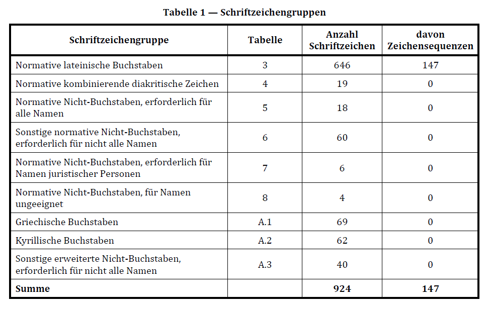 | und der für alle Namen erforderlichen Nicht-Buchstaben nach Tabelle