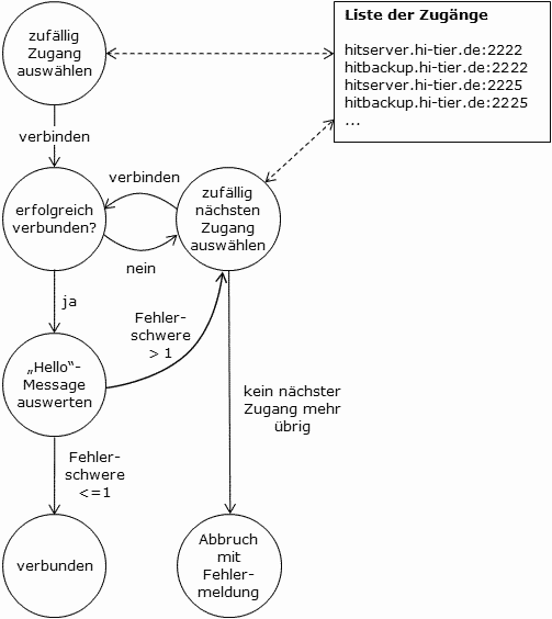 Das Format einer Antwort vom HIT-Server bzgl. der "Hello"-Message wird unten beschrieben. Firewalls, ProxiesAnwender, die direkt mit dem Internet verbunden sind, geben in ihrem Programm nur eine Adresse und den gewünschten Port an, um sich mit uns zu verbinden. Anwender in Firmennetzwerken o.ä., die ein lokales Netzwerk hinter einer Firewall betreiben, müssen in der Firewall mindestens zwei Ports (einen für den Test-Zugang, einen für den Produktions-Zugang) freischalten lassen! Um eine hohe Verfügbarkeit zu gewährleisten, sollten dringend zwei Ports für den Test-Zugang und zwei für den Produktions-Zugang eingerichtet werden und die eigene Anwendung wie oben im Abschnitt "Verfügbarkeit" beschrieben konfiguriert werden. Etwa so: